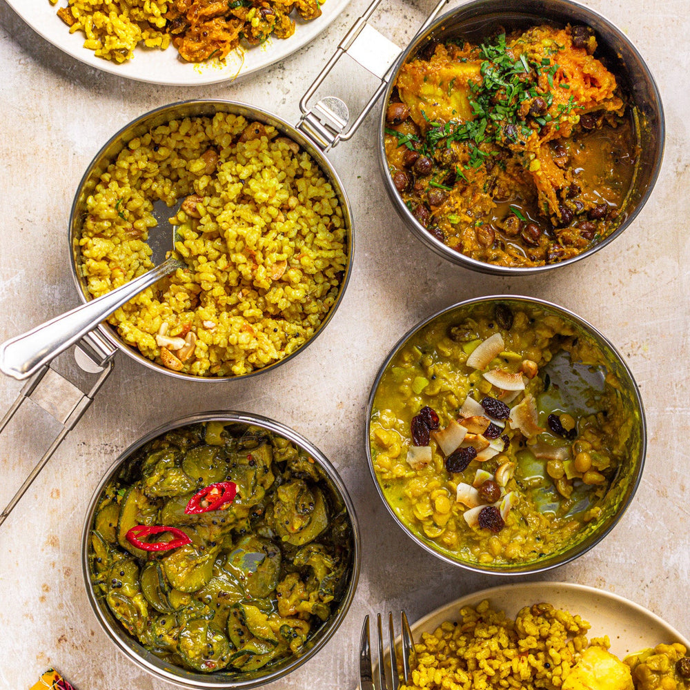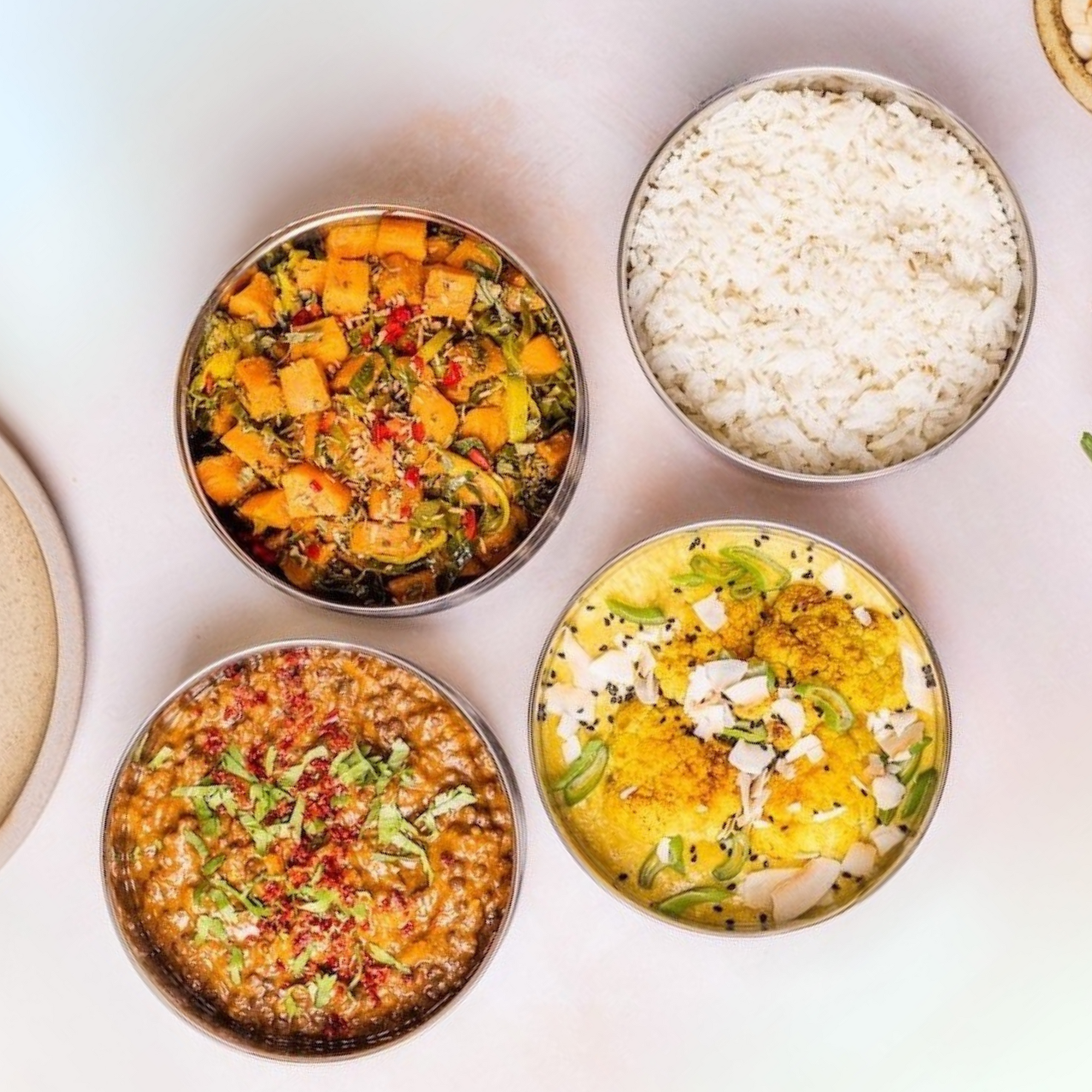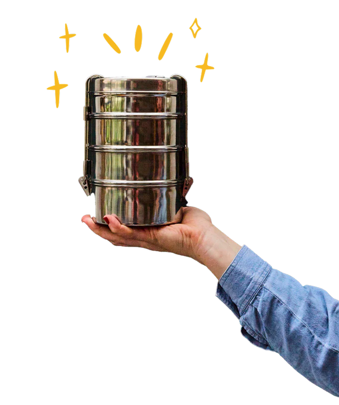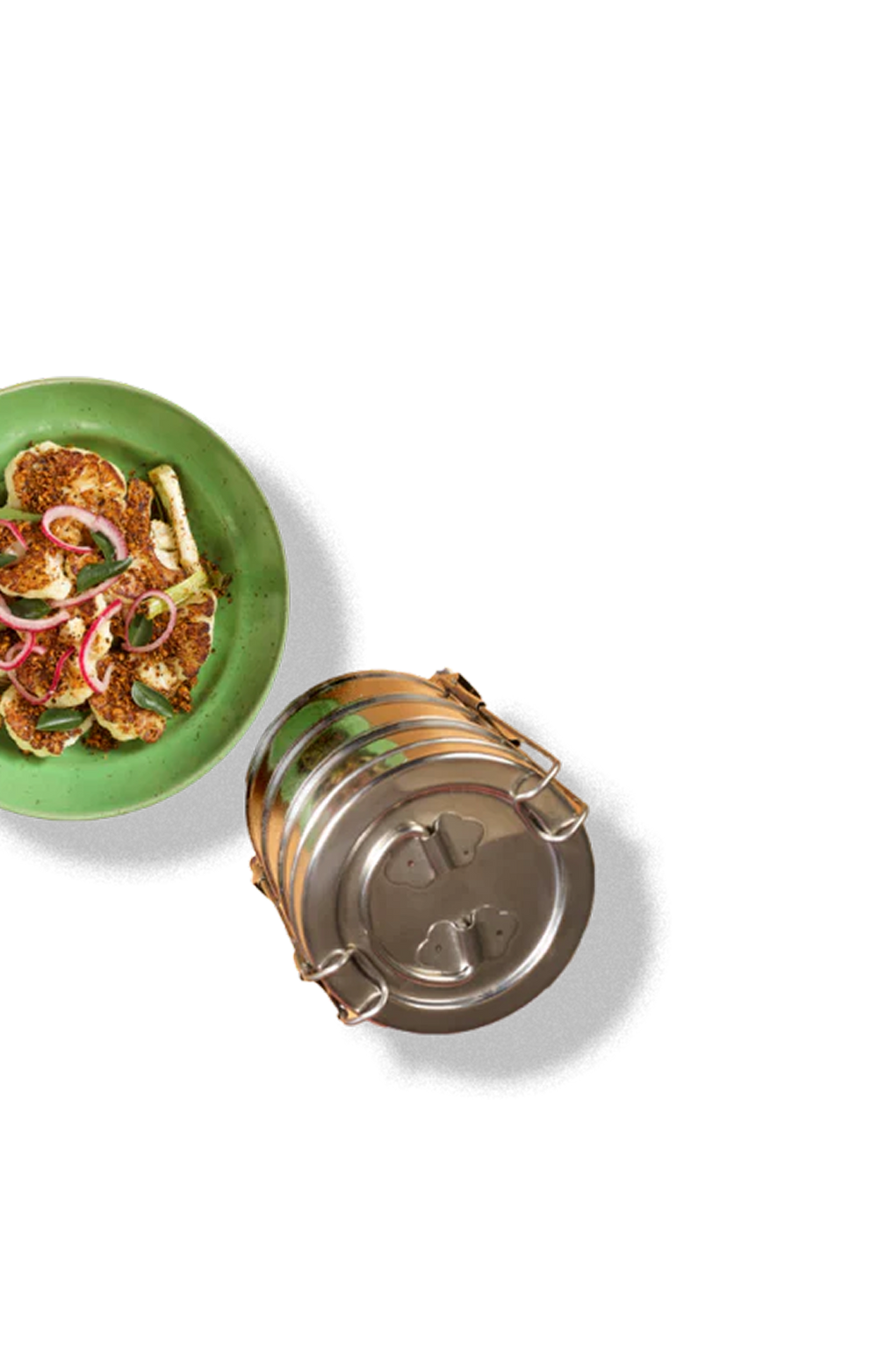 Your DabbaDrop arrives in a reusable steel dabba, filled with fresh Indian food cooked properly - then swapped the following week for a new one.