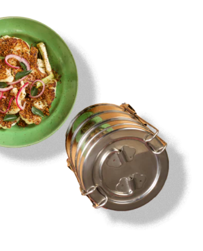 Each dabba includes a balanced plate: A seasonal vegetable curry, a protein or dal, rice or grain, a fresh veg packed side
